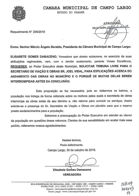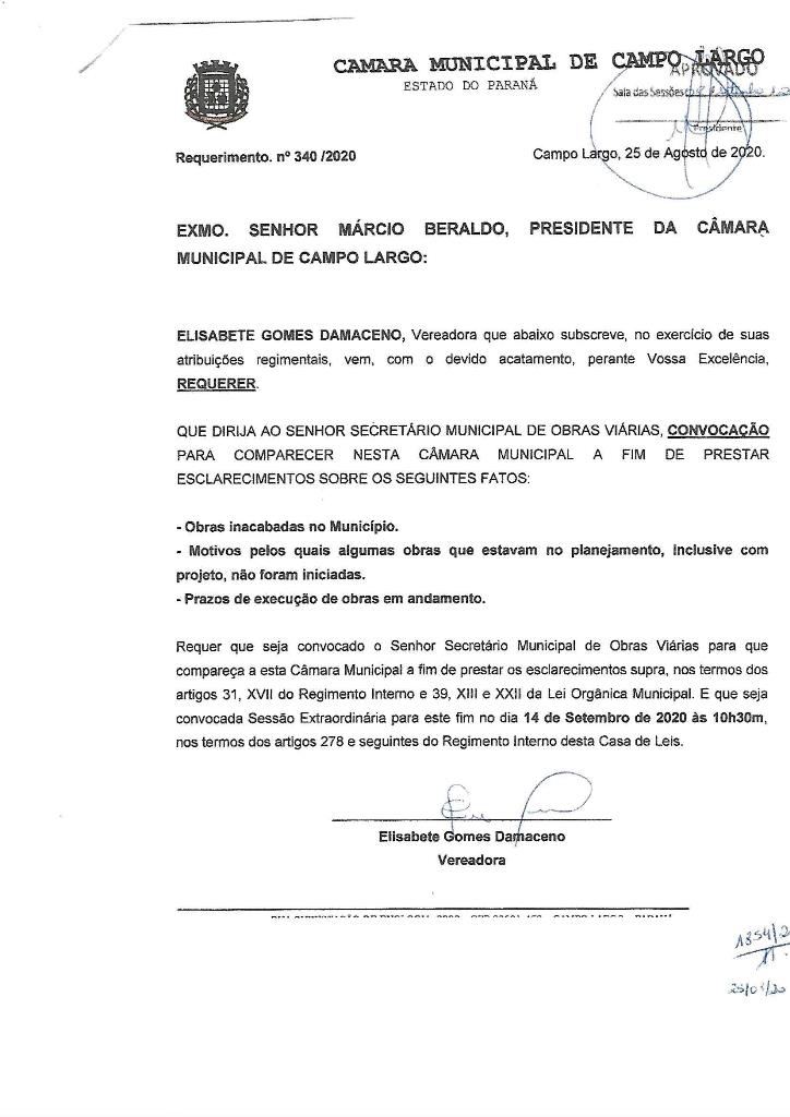 A vereadora Bete Damaceno elencou uma série reclamações da população do Distrito da Ferraria quanto à execução de obras, algumas promessas nem iniciadas foram e outras ficaram pela metade. Algumas localidades não receberam nenhuma benfeitoria. Assim, ao cobrar do Secretário Municipal de Obras, Joel Vidal, a vereadora Bete mencionou os seguintes casos, Rua Carlos Gomes, foi feito a metade e está parado; Rua Araras, obras em duas quadras; Rua Gralha Azul, foi feito até a metade; Rua João Moreira, foi feita a preparação para o asfalto e até agora está paralisada; Não aconteceu nenhuma obra na Vila Torres e nem no Jardim Guarany. Na Vila Dom Pedro, Rua Dourados, foi iniciado o asfalto e o manilhamento; Rua Brasileia, nem Tapa Buracos. A Rua São Pedro e a Rua Hernesto Zoppo, estão pela metade; Rua Aliança, no Passauna, não teve nenhuma atenção, não foi feito nada. A Rua Arnestor Antônio Welter, no Jardim Rondinha, também não. Estas são algumas das reclamações que o povo da Ferraria faz, existem outras. O pedido de convocação do secretário municipal da vereadora Bete está fundamentado no artigo 31, XVII do Regimento Interno e no artigo 39, XIII e XXII da Lei Orgânica do Município. Com base das reclamações da população e em virtude de existirem Obras Inacabadas no Município; Obras que estavam no planejamento, inclusive com projetos, não foram inacabadas e sobre prazos de execução de obras em andamento, a vereadora Bete declara que precisam ser dados esclarecimentos aos vereadores, cuja principal função é de fiscalização. Não pode ser dito que só agora a vereadora Bete está pedindo esclarecimentos. Antes, foi entregue um documento com todas as necessidades dos moradores do Distrito de Ferraria ao prefeito Marcelo Puppi. Ao Senhor Secretário de Obras, Joel Vidal, também, a pedido da vereadora Bete foi solicitado que fizesse uso da Tribuna Livre para explicações sobre a execução de obras, em 2019. Por solicitação da vereadora Bete Damaceno (PSD), na sessão ordinária do dia 13/10 (terça feira), o secretário Municipal de Obras, Joel Vidal respondeu as questões formuladas e falou sobre o andamento de obras, de serviços e melhorias executadas no município. Muita coisa está pela metade devido à falta de recursos. Foram executadas as emergências e muita coisa ainda será finalizada, disse o secretário aos vereadores em plenário. O compromisso foi assumido perante os vereadores presentes.