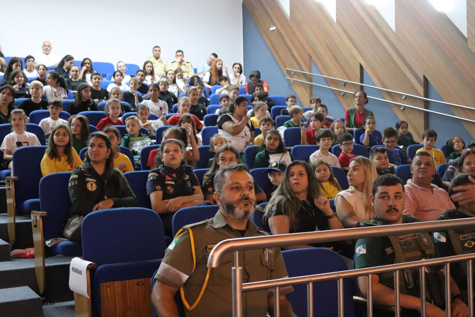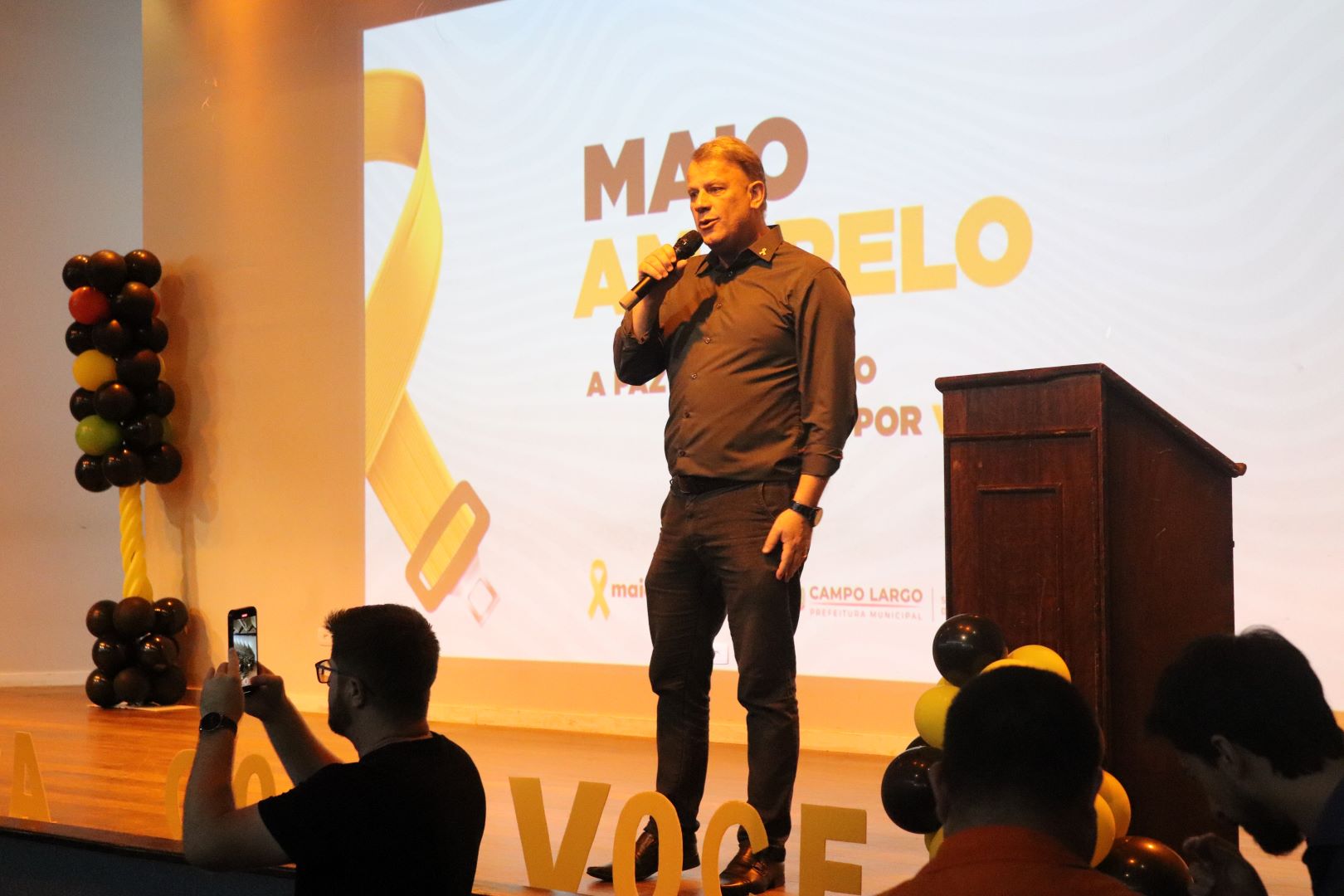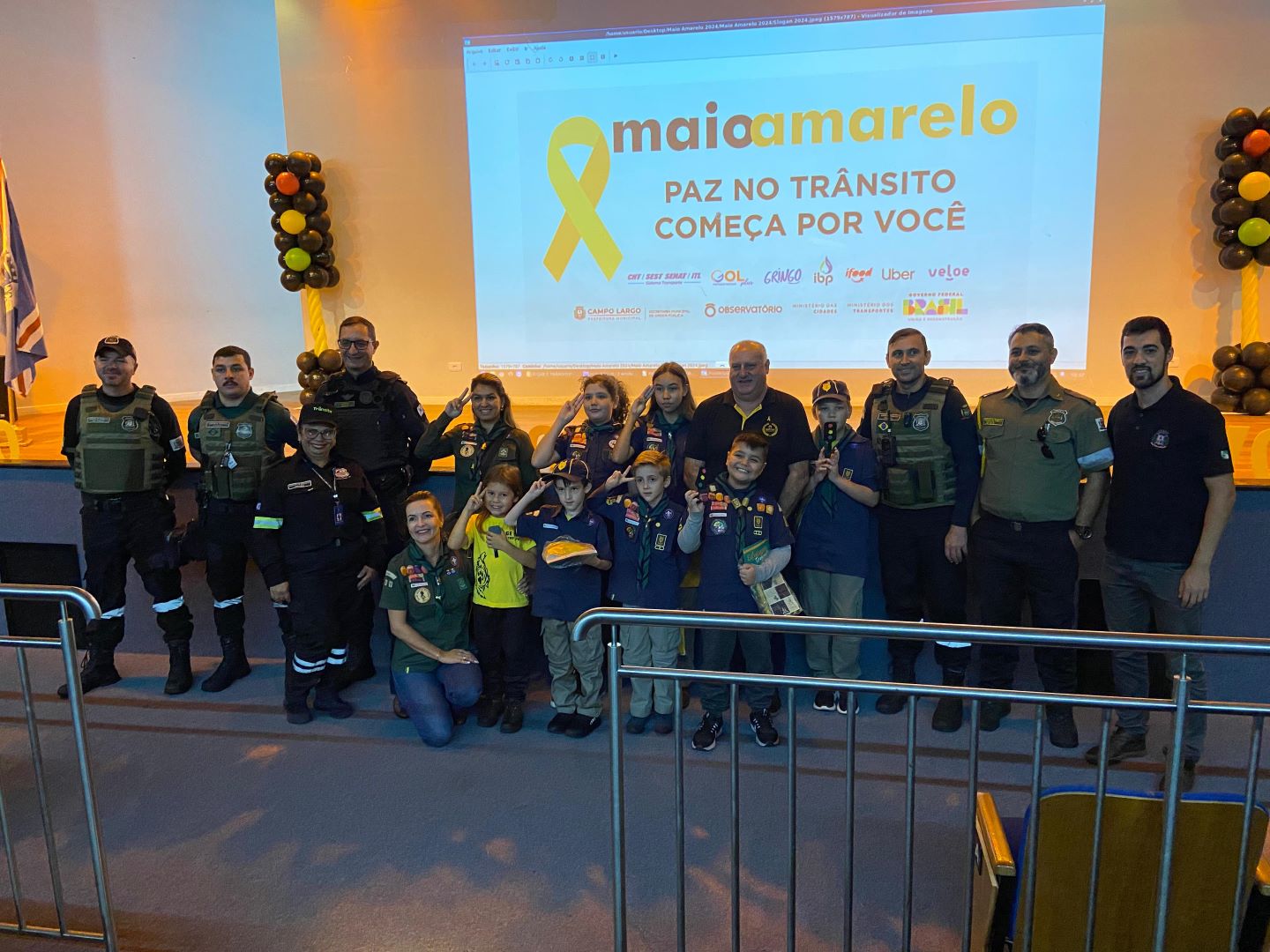 Dezenas de crianças campo-larguenses participaram da abertura do Maio Amarelo da Prefeitura de Campo Largo, que aconteceu no dia 03/05. Pela manhã e à tarde, a Secretaria Municipal de Ordem Pública promoveu, no auditório da Casa da Cultura, uma série de palestras e atividades para estudantes do 5º ano do Ensino Fundamental de escolas municipais e particulares, e integrantes do Grupo Escoteiro ECO 189-PR.