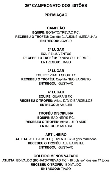 Os organizadores das competições divulgaram que as disputas do 18º Campeonato 50tões tem início no dia 06/07 e o 27º Campeonato 40tões tem início no dia 07/07. As competições do Joacir, são realizados, no campo do Vassoral, na Rua Caetano Munhoz da Rocha (Estrada do Retiro), no Guabiroba, em Campo Largo. Acesse a coluna “Vivendo o Esporte”, por Rosiel Melo, no site metropolitanoonline.com.br para ver mais.