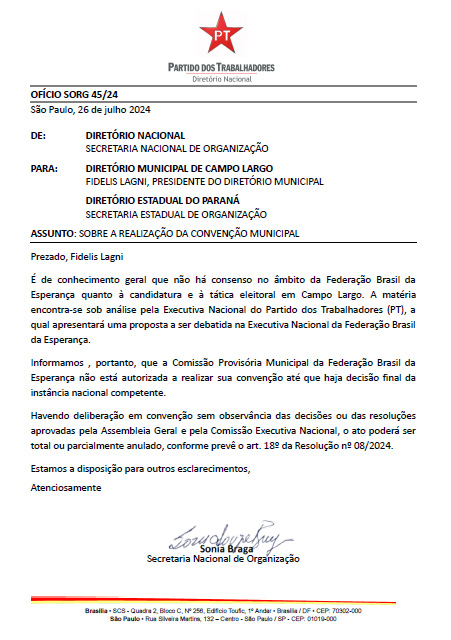 A Federação Brasil da Esperança (PT/PV/PCdoB) de Campo Largo numa outra linha, também, aguarda uma resolução de nível superior e com uma decisão nacional final para realização da efetiva convenção municipal.