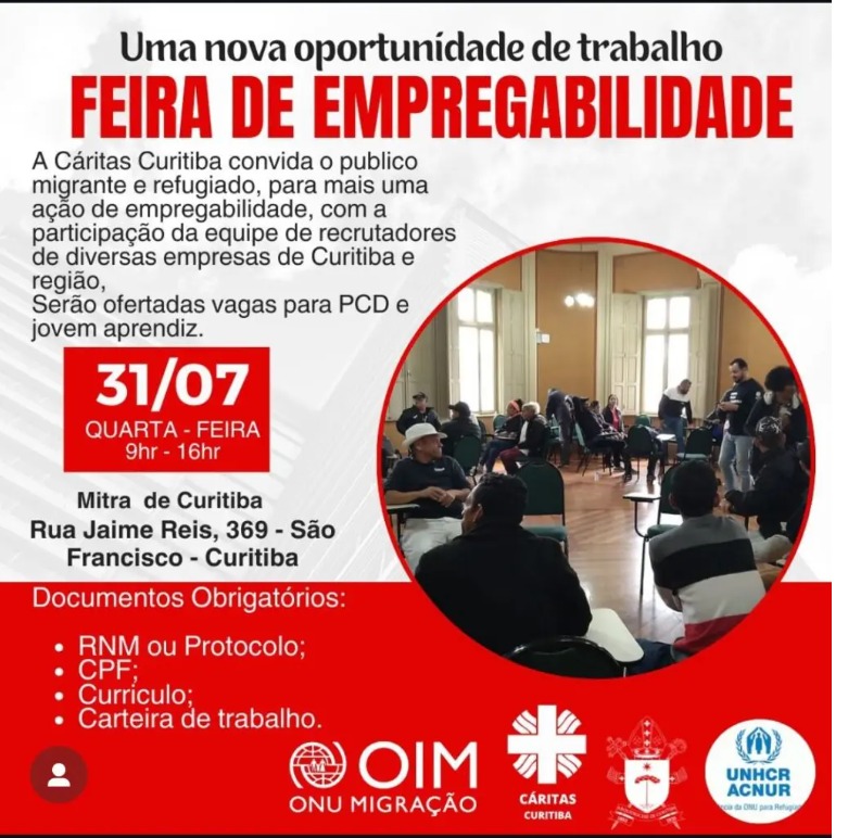 A Via Araucária, em parceria com a Organização Internacional para as Migrações (OIM), participará da Feira de Empregabilidade para migrantes, oferecendo mais de 70 vagas para diversas funções na área de Conservação. O evento será realizado no dia 31 de julho, das 9h às 16h, na Mitra da Arquidiocese de Curitiba.