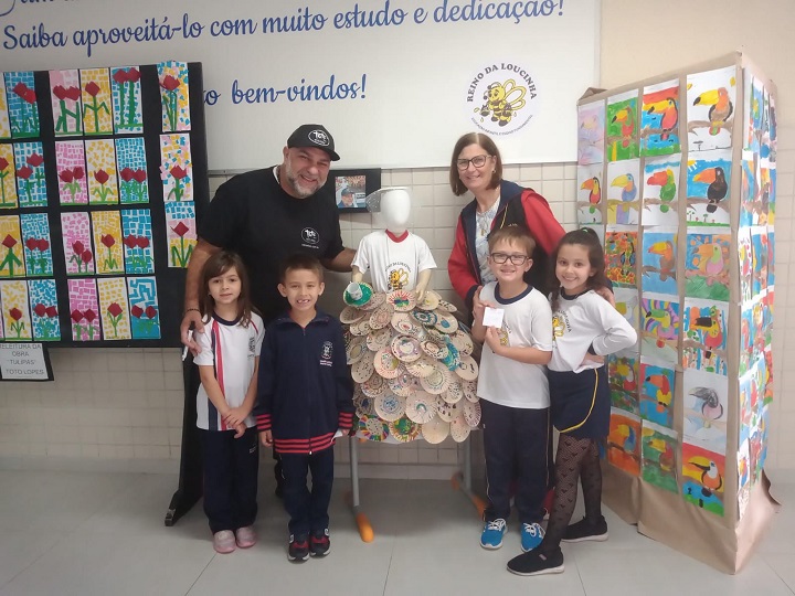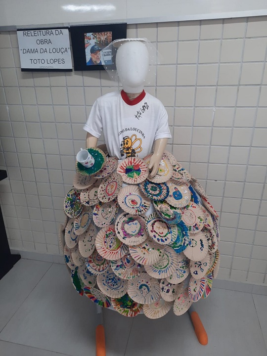 Com 119 pratos de papel decorados, os estudantes das cinco turmas de 1º ano recriaram a obra do artista plástico campo-larguense Toto Lopes para divulgar a 31ª Feira da Louça e a batizaram de “Dama da Loucinha”, em referência também à escola.
