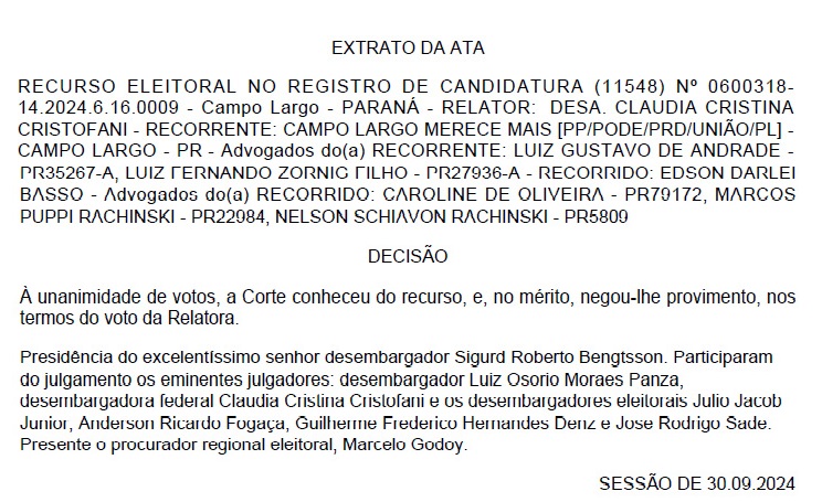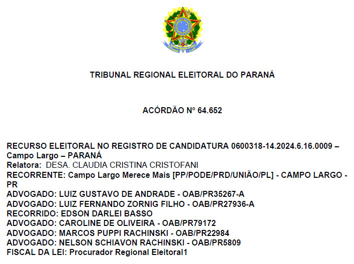 Quanto ao candidato a prefeito de Campo Largo Maurício Rivabem (PSD), foi expedido o acórdão com a seguinte conclusão: