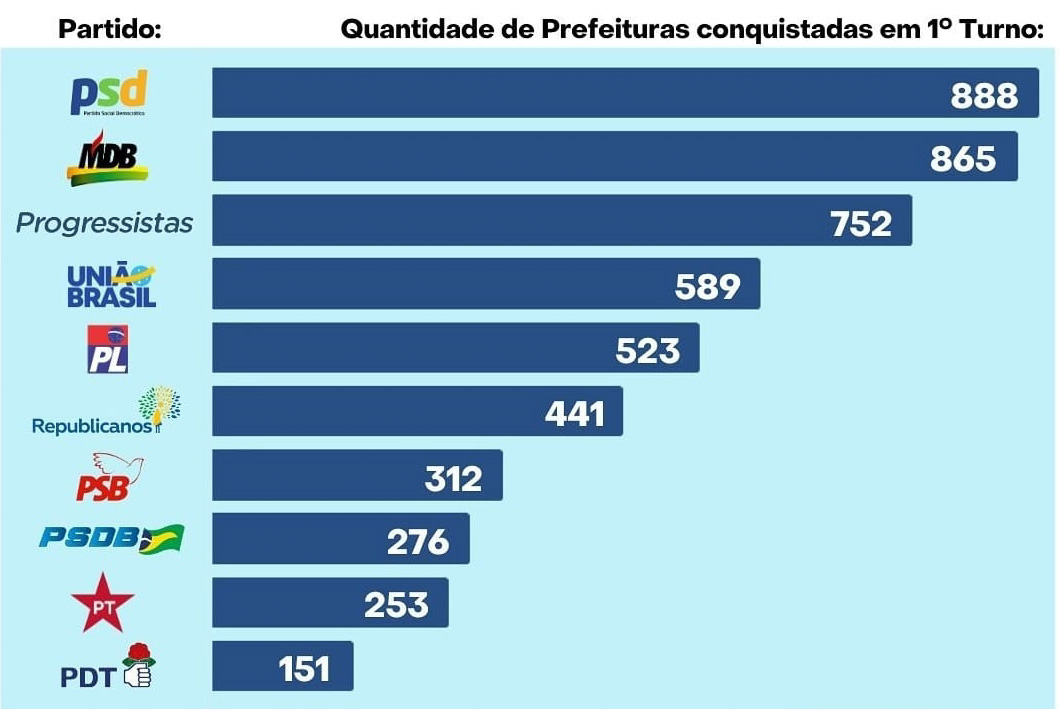 O partido do governador Ratinho Jr., até o momento, conquistou 888 prefeituras, é o maior número de prefeitos entre todos os partidos, seguido do MDB, com 865 prefeitos, por sinal, partido aliado de Ratinho Jr. no Paraná, com base aliada na Alep. Maurício Rivabem (PSD) e Chris Chemin (MDB) eleitos em Campo Largo.