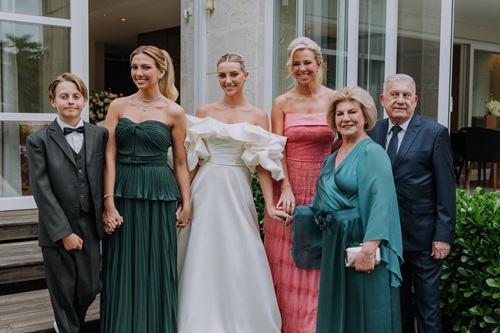A noiva ladeada por Pedro Barrichello Caetano, a irmã Isadora,