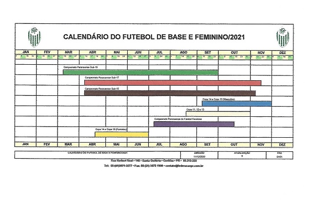 O Calendário de Competições para o ano de 2021 foi divulgado pela Federação Paranaense de Futebol – FPF, no dia 11/12 e assim, a primeira competição oficial da entidade é o Campeonato da 1ª divisão de Profissionais que começa no dia 28 de fevereiro. Os quadros abaixo apresentam os períodos das demais competições propostas e promovidas pela FPF.