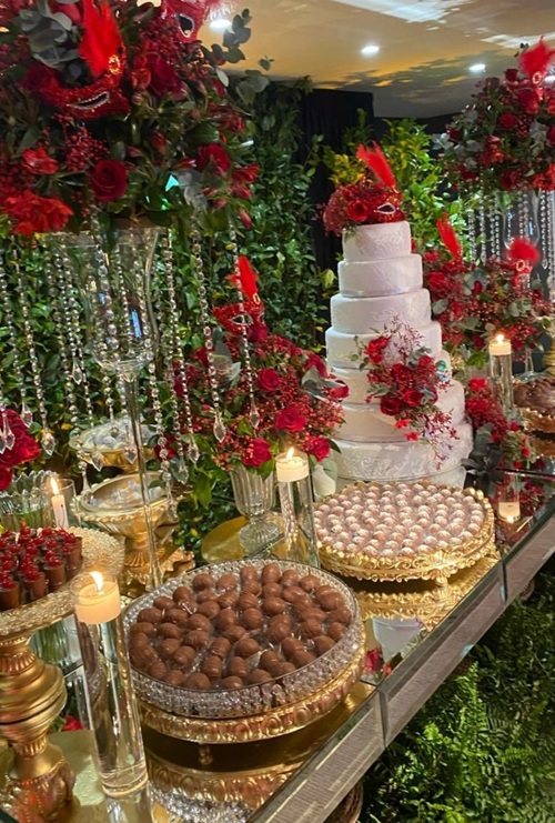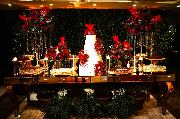 Decoração impecável da mesa de doces.