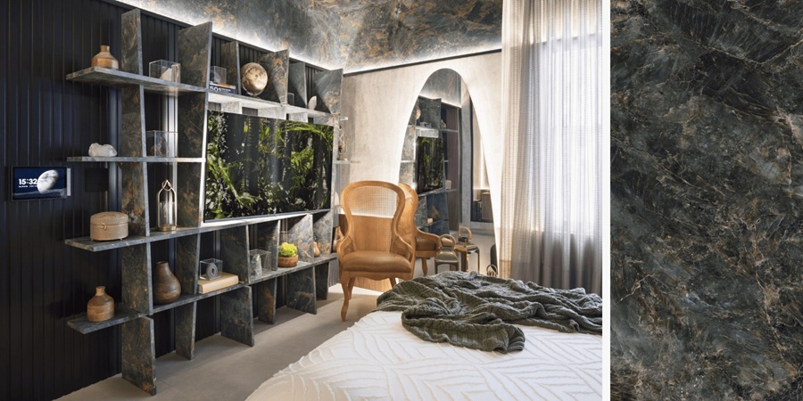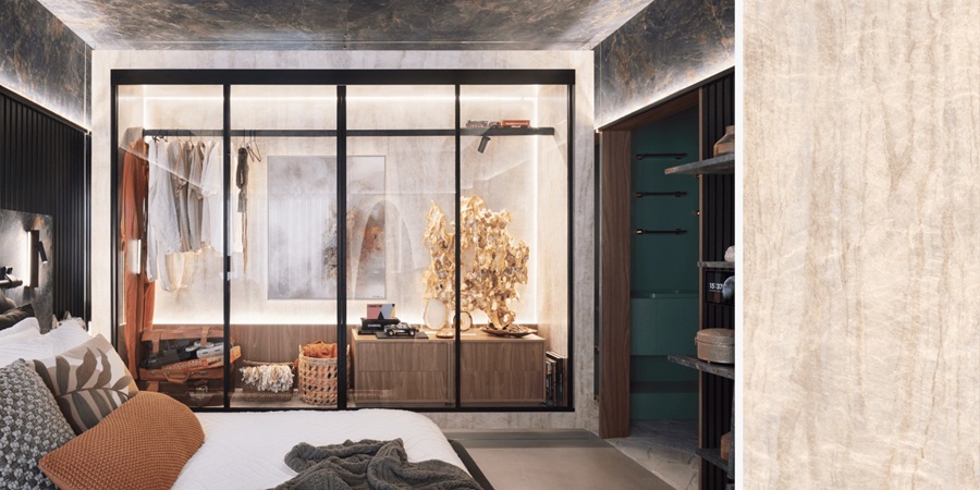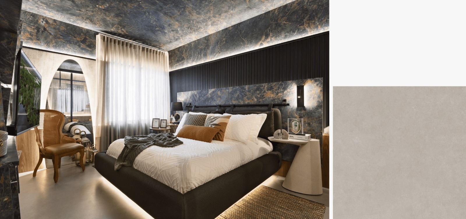 Para o piso, a série Quadra – outro lançamento de 2025 – oferece uma textura sutil inspirada no cimento natural. A cabeceira em pórtico é composta pela série Saint-Tropez, enquanto o closet e a parede com espelho orgânico recebem o toque nobre da série Taj Mahal, que reproduz o quartzito homônimo com naturalidade e sofisticação.