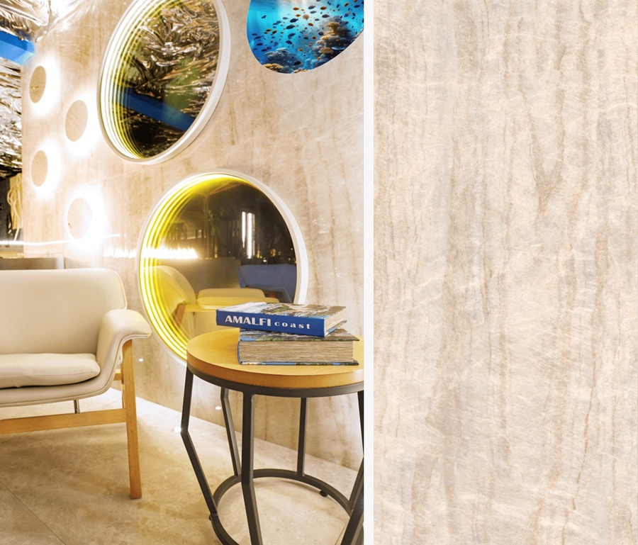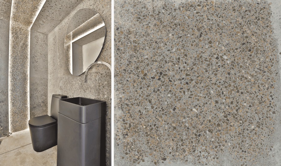 No piso, ele escolheu a série Petram, com a textura da pedra natural evidenciada por meio da tecnologia exclusiva Mineral Lab, que funde minerais nobres aos veios da peça com precisão milimétrica. O processo inclui aplicação de granilhas que conferem efeitos visuais surpreendentes e maior resistência ao escorregamento, sendo ideal para ambientes de grande circulação.