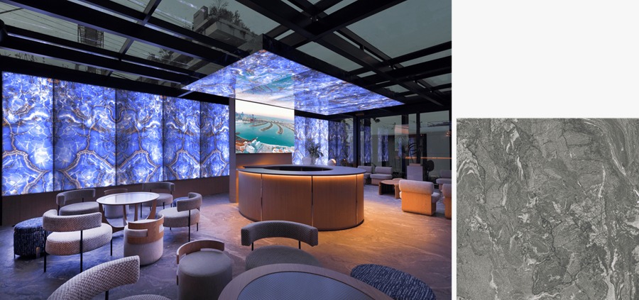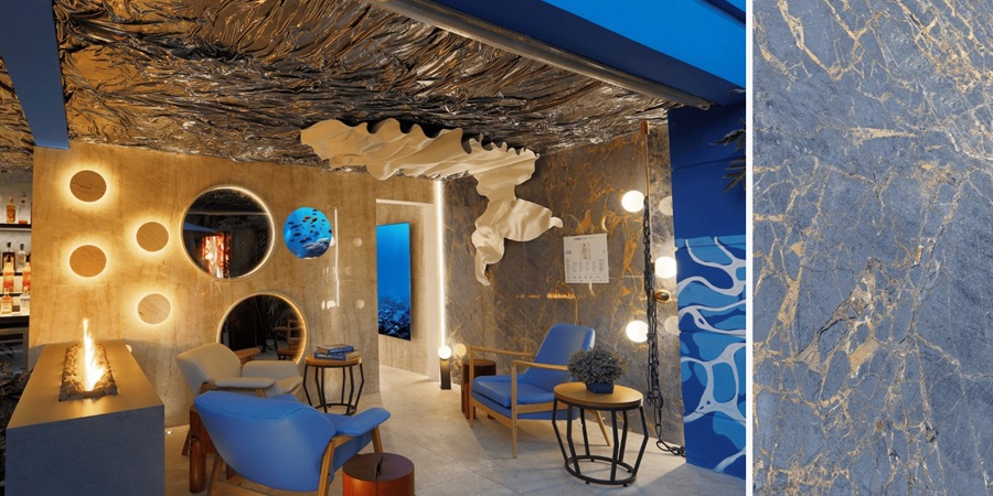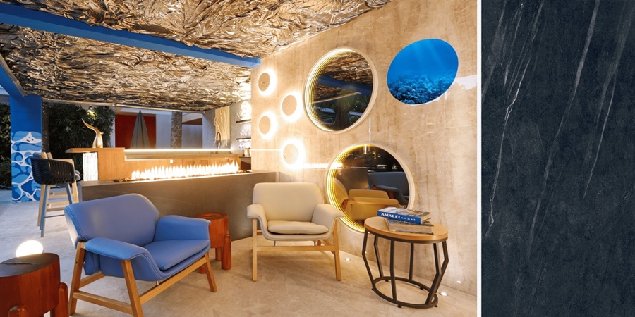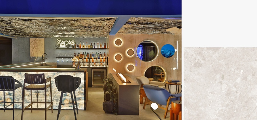 Inspirado nos mistérios e na imensidão do oceano, o ambiente assinado pelo arquiteto Givago Ferentz proporciona uma experiência sensorial que simula o fundo do mar. Cores, formas e elementos remetem ao universo marinho, compondo um espaço imersivo e surpreendente. No espaço, utilizou cinco revestimentos da Roca Cerámica: Ceppo di Gre, Taj Mahal, Marble Nouveau, Hangar e Infinity.