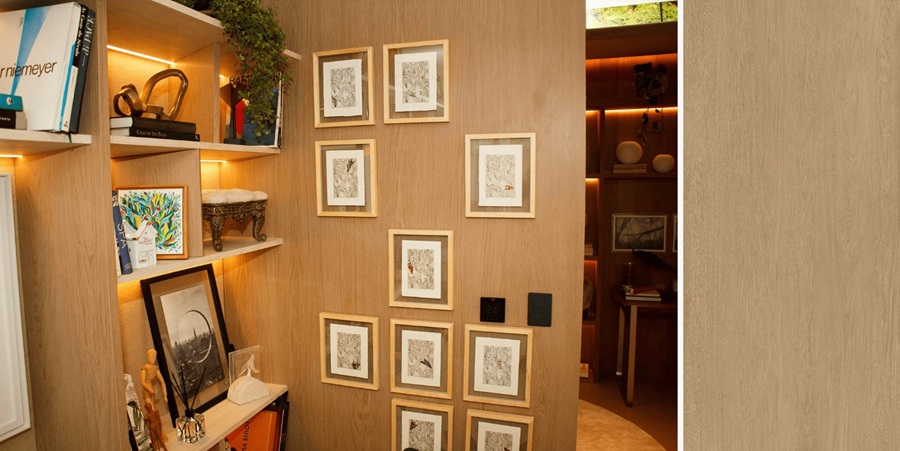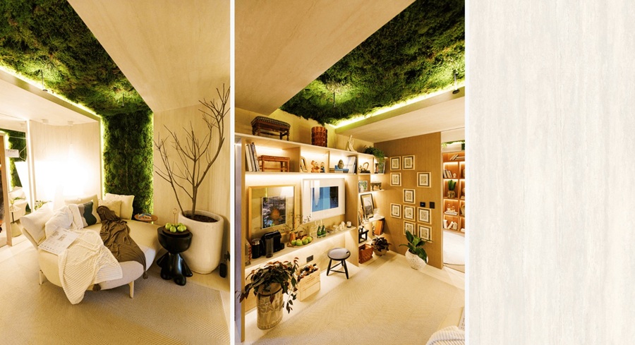 Para compor essa atmosfera acolhedora, os profissionais utilizaram a série Navona, no tom Natural, no piso, paredes e teto, com estética inspirada no Mármore Travertino. Já a série Legno Rovere, que reproduz com precisão a textura e o toque da madeira, imprime aconchego e elegância ao espaço, especialmente com o acabamento carving, que valoriza os veios naturais.