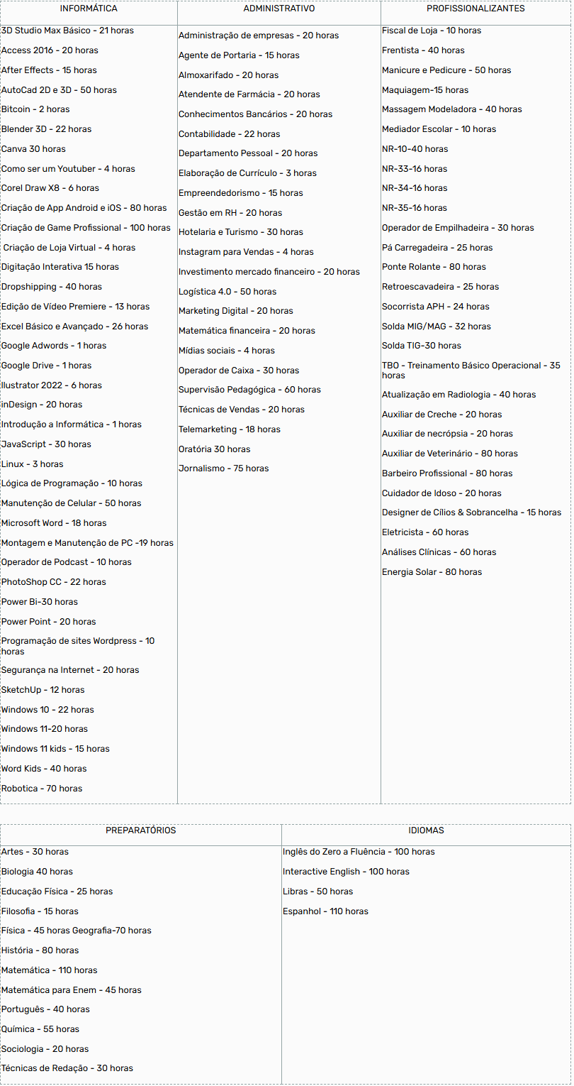 Disponíveis na modalidade de Ensino à Distância (EaD) e gratuitamente, ao todo a iniciativa oferece 112 cursos divididos em cinco áreas principais. São eles: