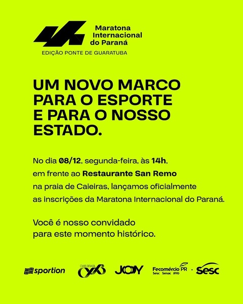 A cerimônia oficial de lançamento e abertura das inscrições da Maratona Internacional do Paraná 2026 acontece na segunda-feira, 08 de dezembro, a partir das 14h, diretamente das obras da Ponte de Guaratuba.