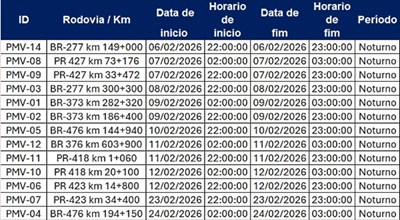 A Via Araucária dará início à implantação de 14 Painéis de Mensagem Variável (PMVs), uma ação que reforça o compromisso da companhia com a segurança viária e a comunicação em tempo real com os usuários. Para a instalação dos equipamentos, será necessária a realização de bloqueios totais e temporários de tráfego, sempre no período noturno, entre os dias 06 e 23 de fevereiro, conforme cronograma operacional. As interdições terão duração estimada de até uma hora em cada local.