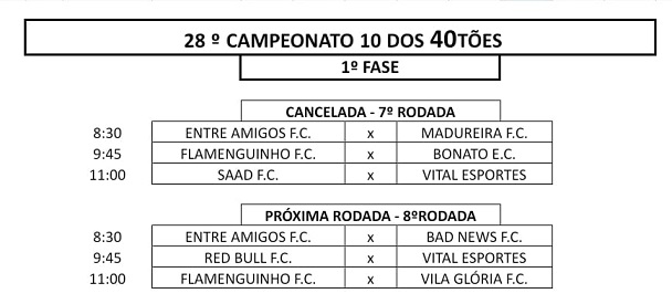Os jogos pelo 19º Campeonato 50tões e pelo 28º Campeonato 40tões acontecem no final de semana, 05/07 e 06/07, respectivamente, caso o estado do gramado permita e seguindo as tabelas divulgadas pelos organizadores. A classificação permanece inalterada, a consulta pode ser feita na edição anterior.